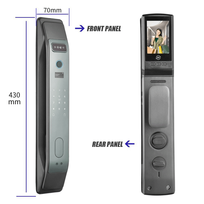 در پنل بیرونی قفل هوشمند F300 در ابتدا دوربینهای تشخیص چهره را مشاهده میکنید که همانطور که در بخش قبل توضیح داده شد، این دوربین با قرار گرفتن در مقابل دستگیره فعال میگردد. همچنین این دوربینها، چشمی دیجیتال قفل دیجیتال نیز هستند.