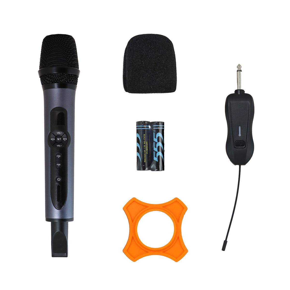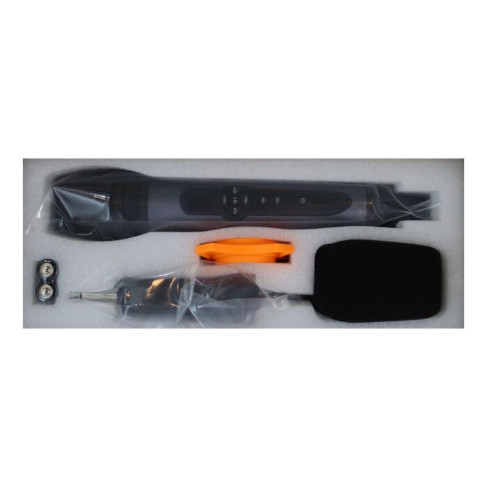- محتویات جعبه: یک عدد میکروفن دستی- یک دانگل بی سیم گیرنده، پد میکروفن- پایه ژلاتینی- باتری و کابل شارژ